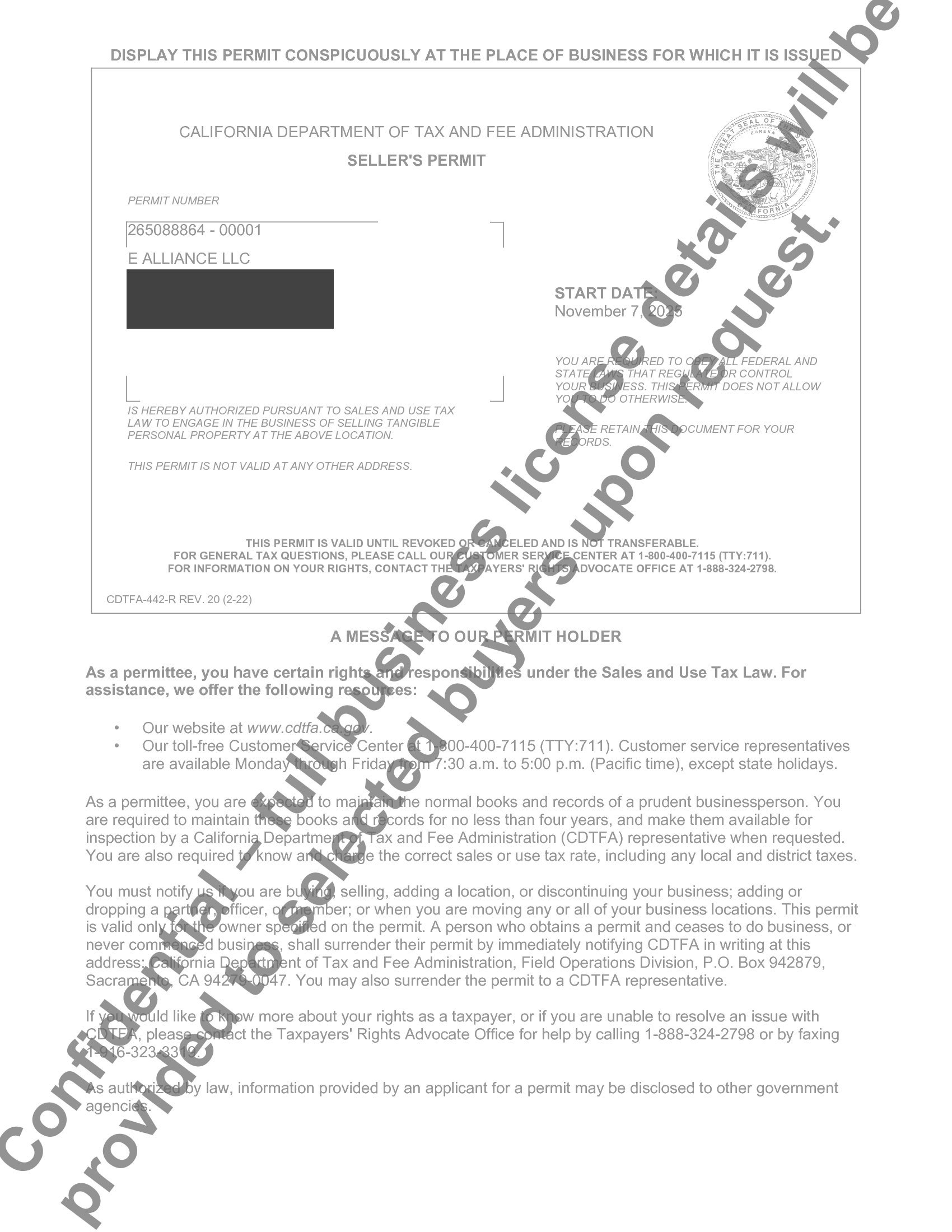 Business Certificates Certified LLC Registration Reseller Permit EIN Tax # SGS Certificate Interested in working with us? Inquire to Purchase